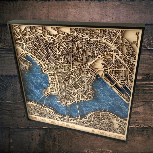立體木雕刻香港地圖連金屬框